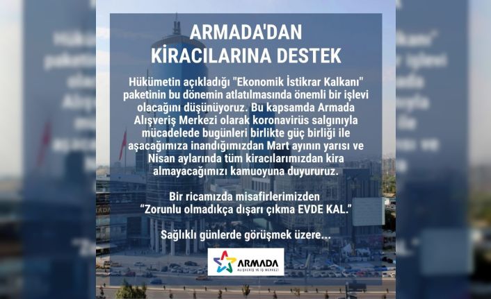Armada Alışveriş ve İş Merkezi’nin açıklamasında ise, “Hükümetin açıkladığı ‘Ekonomik İstikrar Kalkanı’ paketinin bu dönemin atlatılmasında önemli bir işlevi olacağını düşünüyoruz. Bu kapsamda Armada Alışveriş Merkezi olarak koronavirüs salgınıyla mücadelede bugünleri birlikte güç birliği ile aşacağımıza inandığımızdan Mart ayının yarısı ve Nisan aylarında tüm kiracılarımızdan kira almayacağımızı kamuoyuna duyururuz. Bir ricamız da misafirlerimizden, ‘Zorunlu olmadıkça dışarı çıkma ‘EVDE KAL’. Sağlıklı günlerde görüşmek üzere” ifadelerine yer verildi.