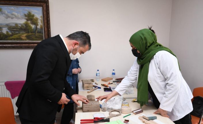 Bu kapsamda kursiyerlerin eğitim gördüğü sınıfları tek tek ziyaret eden Başkan Ertuğrul Çetin, el becerilerinin ortaya konduğu çalışmaları yakından inceledi.