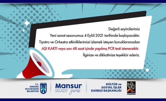 Ankara Büyükşehir Belediyesi Başkent Tiyatroları yeni sanat sezonunda yepyeni oyunlar ve etkinliklerle seyircisiyle buluşmaya hazırlanıyor. Yeni sanat sezonunu 4 Eylül 2021 tarihinde başlatacak olan Ankara Büyükşehir Belediyesi Kültür ve Sosyal İşler Daire Başkanlığı, tiyatro ve orkestra etkinliklerini izlemek isteyen vatandaşlardan aşı kartı veya son 48 saat içinde yapılmış PCR testi isteneceğini duyurdu.