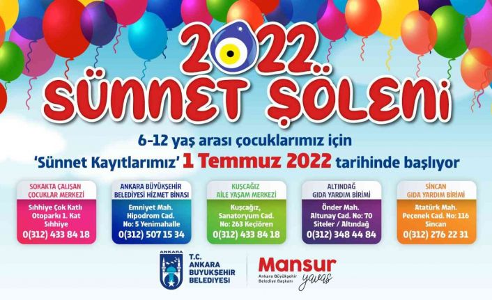 Ankara Büyükşehir Belediyesi, bu yıl 6-16 yaş arası bin çocuğu ücretsiz sünnet ettirecek. Pandemi nedeniyle 2 yıl ara verilen toplu sünnet şöleni için 1 Temmuz tarihinden itibaren başvurular alınmaya başlanacak. Aileler kayıt için Ankara Büyükşehir Belediyesi Hizmet Binası Sosyal Hizmetler Daire Başkanlığı Halka İlişkiler Bankosu, Sokakta Çalışan Çocuklar Merkezi, Kuşcağız Aile Yaşam Merkezi, Altındağ Gıda Yardım Birimi ve Sincan Gıda Yardım Birimi’ne istenilen evraklar ile başvuru yapabilecek. “(0312) 507 15 34” numaralı telefondan detaylı bilgi alabilecek olan aileler, sünnet olacak çocuklarının ve kendilerinin kimlik fotokopisi ve ikametgâh ilmühaberi ile kayıt yaptırabilecek.