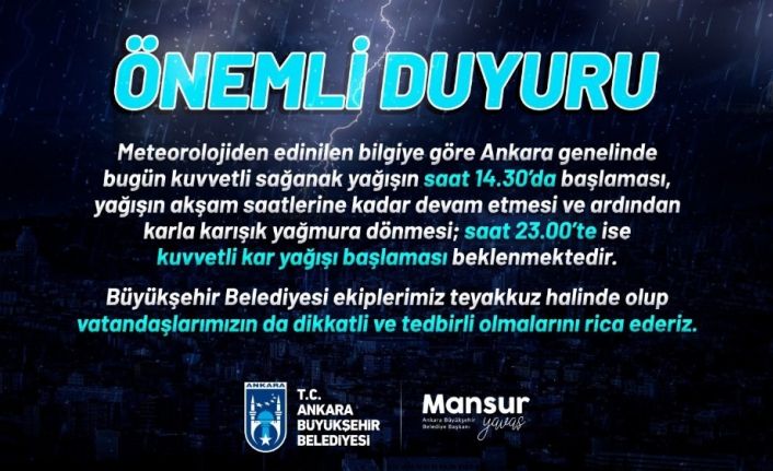Sosyal medya hesabından yapılan paylaşımda, “Meteorolojiden edinilen bilgiye göre, Ankara genelinde bugün kuvvetli sağanak yağışın saat 14.30’da başlaması, yağışın akşam saatlerine kadar devam etmesi ve ardından karla karışık yağmura dönmesi; saat 23.00’te ise kuvvetli kar yağışı başlaması beklenmektedir. Büyükşehir Belediyesi ekiplerimiz teyakkuz halinde olup vatandaşlarımızın da dikkatli ve tedbirli olmalarını rica ederiz” ifadeleri kullanıldı.