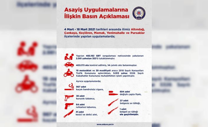 Başkent’te 4-18 Mart tarihleri arasında Altındağ, Çankaya, Keçiören, Mamak, Yenimahalle ve Pursaklar ilçelerinde polis ekipleri tarafından gerçekleştirilen asayiş uygulamalarında 485 bin 182 kişiye Genel Bilgi Taraması (GBT) yapıldı. GTB sonrası yakalanan 2 bin 561 kişiden 353’ü tutuklanarak cezaevine gönderildi.