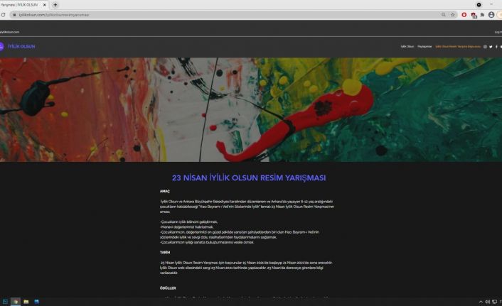 Ankara Büyükşehir Belediyesi pandemi sürecinde sivil toplum kuruluşlarıyla iş birliği yaparak milli bayramları çeşitli etkinliklerle kutlamaya devam ediyor. İyilik Olsun ile birlikte bu yıl 23 Nisan Ulusal Egemenlik ve Çocuk Bayramı nedeniyle ‘23 Nisan iyilik olsun’ adlı bir resim yarışması düzenleyen Büyükşehir Belediyesi, Ankara’da yaşayan 6-12 yaş arası çocukların evlerinde hazırladıkları resimlerle 21 Nisan tarihine kadar başvuru yapabileceğini duyurdu. Ankara’da yaşayan 6-12 yaş arası çocuklar, 21 Nisan tarihine kadar “iyilikolsun.com” adresi üzerinden yarışmaya başvuruda bulunabilecek.