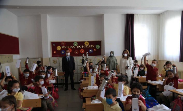 Gölbaşı Belediye Başkanı Ramazan Şimşek, merkez bölgedeki okullarda öğrencilere suluk hediye etti.