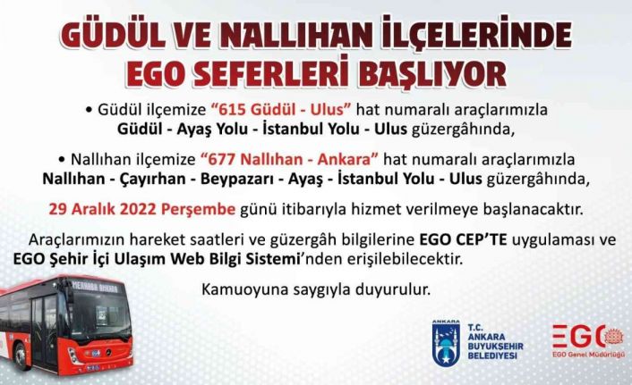 EGO Genel Müdürlüğü, Güdül ve Nallıhan’da ikamet eden vatandaşların EGO otobüsleri ile Ankara kent merkezine ulaşımlarının sağlanması için ring seferleri başlattı. Güdül ilçesine "615 Güdül-Ulus" hat numaralı araçlar "Güdül, Ayaş Yolu, İstanbul Yolu, Ulus" güzergahında, Nallıhan ilçesine ise "677 Nallıhan-Ankara" hat numaralı araçlar "Nallıhan, Çayırhan, Beypazarı, Ayaş, İstanbul Yolu, Ulus" güzergahında 29 Aralık 2022 Perşembe günü itibarıyla hizmet vermeye başlayacak. Araçların hareket saatleri ve güzergah bilgilerine ise EGO Cep’te uygulaması ve EGO Şehir İçi Ulaşım Web Bilgi Sistemi’nden erişim sağlanabilecek.