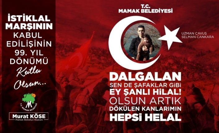 Mamak Belediyesi tarafından İstiklal Marşı’nın kabulünün 99’uncu yıl dönümünde gerçekleştirilen etkinlikte İdlib şehitleri de unutulmadı. İstiklal Marşı’nın kabulünün kutlandığı tasarımlarda milli marşın “Dalgalan sen de şafaklar gibi ey şanlı hilal. Olsun artık dökülen kanlarımızın hepsi helal” dizelerini de alıntılayan belediye, etkinlikte kahraman şehitlerin fotoğraflarına da yer verdi.