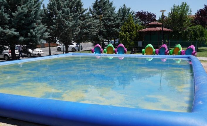 Miniklerin eğlence merkezi haline gelen 120 metrekarelik genişliğe sahip portatif havuzdaki mini botlara sırayla binilirken aynı zamanda ücretsiz olarak hizmet veriyor. Minikler, bottaki pedalları elleriyle çevirerek suyun üzerinde gezinti yapıyorlar.