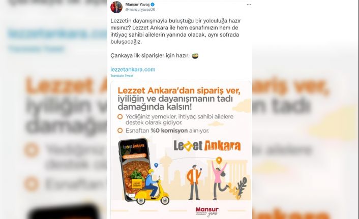 “Lezzet Ankara’dan sipariş ver, iyiliğin ve dayanışmanın tadı damağında kalsın” sloganıyla sosyal medya hesapları üzerinden yaptığı paylaşımda, Lezzet Ankara üzerinden yüzde 0 komisyonla bir yandan esnafa destek olunurken, her verilecek siparişin sosyal yardım alan ailelere de destek olarak yansıtılacağını sosyal medya hesapları üzerinden yaptığı paylaşımla duyuran Büyükşehir Belediye Başkanı Mansur Yavaş, Başkentlilere şu sözlerle seslendi: