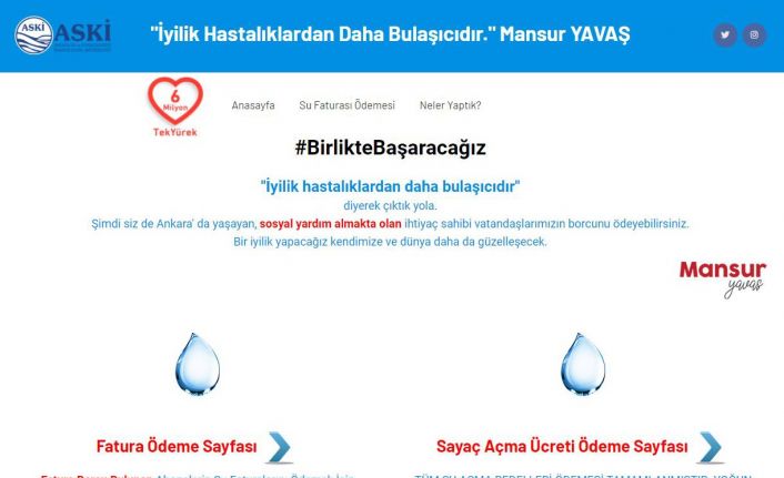 Ankara Büyükşehir Belediye Başkanı Mansur Yavaş, pandemi süreci ve ekonomik kriz nedeniyle su faturalarını ödemekte zorlanan vatandaşlar için destek çağrısında bulundu. Sosyal medya hesaplarından açıklama yaparak yeni bir toplumsal dayanışma hareketi başlatan Yavaş, “Gelin, su kullanımının arttığı pandemi sürecinde yine iyilikte bir damla olalım. Dayanışmaya el verelim. Sosyal yardım alan ailelerimizin su faturasını ödemek için: https://suver.aski.gov.tr” ifadelerini kullandı.