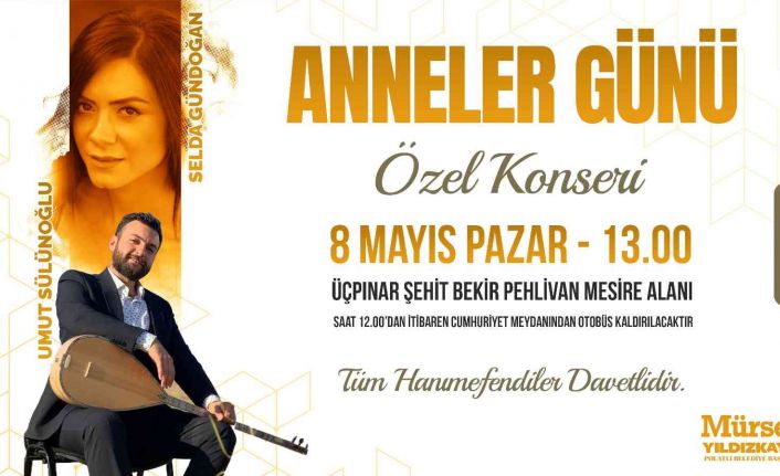8 Mayıs Pazar günü saat 13.00’da Üçpınar Mahallesi Şehit Bekir Pehlivan Mesire Alanı’nda ücretsiz olarak gerçekleştirilecek olan Anneler Günü Özel Konseri’nde ünlü sanatçılar Umut Sülünoğlu ve Selda Gündoğan sahne alacak. Konsere katılmak isteyen vatandaşlar için saat 12.00’dan itibaren Cumhuriyet Meydanı’nda otobüs kaldırılacak. Belediye Başkanı Mürsel Yıldızkaya’nın da katılacağı anlamlı etkinliklerde Anneler Günü’nü coşkuyla kutlanacak. Birbirinden eğlenceli konserler ve etkinlikler sonrası vatandaşlara saat 15.00’da Üçpınar Şehit Bekir Pehlivan Mesire Alanı’nda kurulacak olan sofrada yemek ikramında bulunulacak.