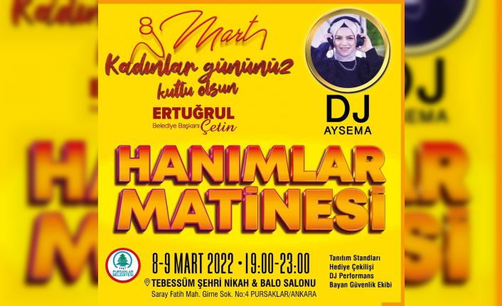 Pursaklar’da 8 Mart Dünya Kadınlar Günü nedeniyle düzenlenecek olan Hanımlar Matinesinde kadınlar eğlenceye doyacak. Pursaklar Belediyesi’nin organize ettiği organizasyonda Türkiye’de geniş bir kesim tarafından tanınan ve sevilen ünlü DJ’lerden Aysema’da yer alacak.