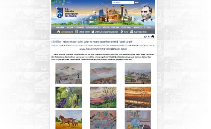 Ankara Rüzgarı Kültür Sanat ve Yaşamı Destekleme Derneği üyesi sanatçılarının eserleri Ankara Büyükşehir Belediyesi internet sitesinde sergilenmeye başladı. Resim, ebru, keçe, çini, rölyef, seramik, heykel ve baskı sanatına ait 100’e yakın eserin sergilendiği karma sergi Büyükşehir Belediyesi resmi internet sitesinde sanatseverlerle buluşuyor.