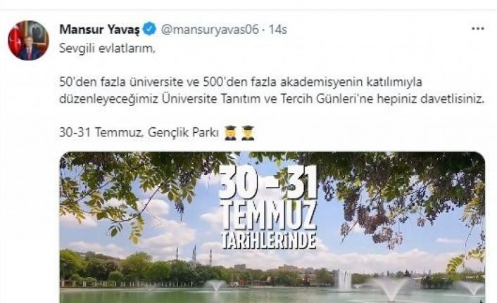 Ankara Büyükşehir Belediye Başkanı Mansur Yavaş, Yükseköğretim Kurumu Sınavı’na (YKS) giren öğrencilere sosyal medya hesapları üzerinden çağrıda bulunarak ilkini düzenleyecekleri Üniversite Tanıtım ve Tercih Günleri’ne davet etti.