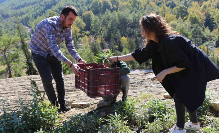 Antalya Büyükşehir Belediyesi tarafından Akseki Sinanhoca Mahallesi’nde üreticilere hibe edilen adaçayı fideleri hasat edilmeye başlandı.