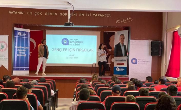 Antalya Büyükşehir Belediyesi Gençlik ve Spor Hizmetleri Dairesi Başkanlığı tarafından Dış İlişkiler Dairesi Başkanlığı ve Akseki İlçe Hizmetleri Şube Müdürlüğü işbirliğiyle Akseki Anadolu Lisesi, Akseki Şahinler Mesleki ve Teknik Anadolu Lisesi ve Akseki İmam Hatip Lisesi öğrencilerine yönelik ‘Gençlik Fırsatları’ başlıklı bilgilendirme toplantısı yapıldı.