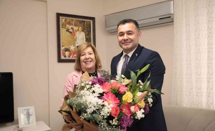 Başkan Yücel, İlkokul Öğretmeni Müşerref Demirci’ye ziyaretin anısına çiçek takdim ederek hatıra fotoğrafı çektirdi.