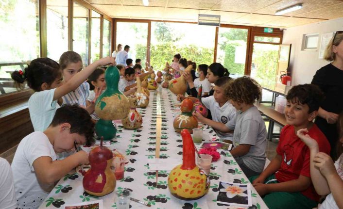Alanya’da minik öğrenciler, ressamların gözetiminde su kabaklarını rengarenk boyadı.
