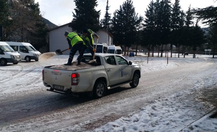 Antalya’da buz tutan yollarda tuzlama çalışması