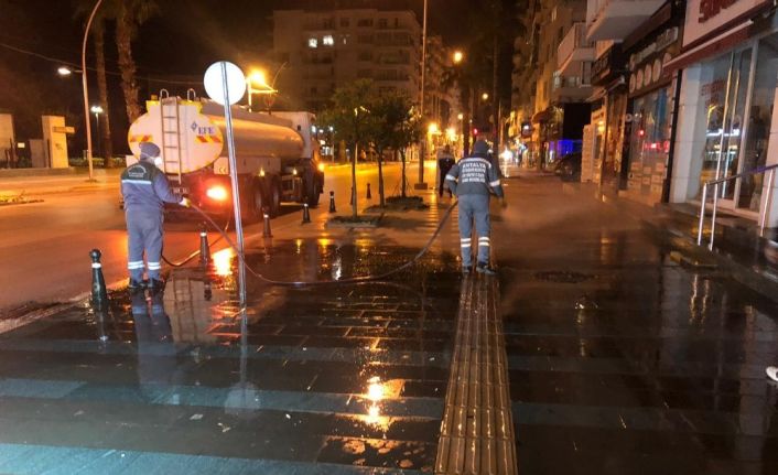 Cumhuriyet Meydanı, Saat Kulesi, Ali Çetinkaya Caddesi, Meltem Mahallesi, Defterdarlık Bulvarı, Antalya Eğitim ve Araştırma Hastanesi Caddesi, Konyaltı Caddesi, Yavuz Özcan Parkı Cumhuriyet Caddesi, Şehit Binbaşı Cengiz Toytunç Caddesi, Atatürk Caddesi, Işıklar Caddesi, Güllük Anafartalar Caddesi, Kapalıyol, Mark Antalya önü, Karaoğlan Parkı, Yıldız Caddesi, Kazımkarabekir Caddesi, Tonguç Caddesi, Teomanpasa Caddesi, Abdi İpekci Caddesi ve Şarampol Caddesi, SGK Kavşağı ve diğer bölgelerle, ilçeler, gece 22 personel iki arazöz, gündüz 225 personel ile dezenfekte ediliyor.