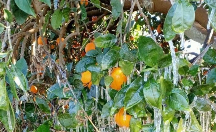 Antalya’nın Finike ilçesinde zirai don uyarısı sonrası harekete geçen çiftçiler, ilçenin önemli tarım ürünlerinden portakalın donmaması için gece boyunca spring sulama yaptı. Yapılan spring sulama sonrası portakal ağaçlarında buz sarkıtları oluştu.