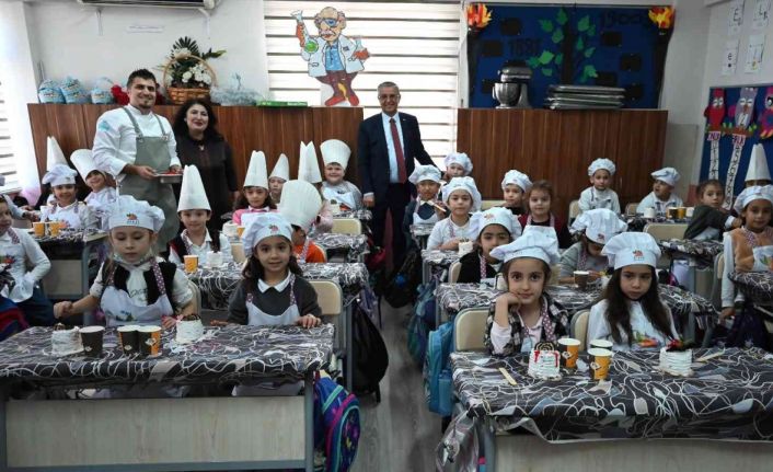 Kemer Belediyesi tarafından yaptırılan aşçı kıyafetlerini giyen minik öğrenciler, Akdeniz Üniversitesi Göynük Mutfak Sanatları Meslek Yüksekokulu öğretmenleri ve öğrencileriyle pasta yaparak keyifli anlar yaşadı.