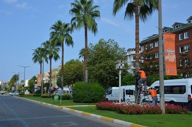 Ziraat mühendisleri eşliğinde, Antalya merkez ve ilçelerde sorumluluk alanı içinde bulunan hurma ve palmiye ağaçlarının tespitini yapan Park ve Bahçeler Şube Müdürlüğü ekipleri bakım ve ilaçlama çalışması gerçekleştiriyor. Ekipler, Nisan ile Eylül ayları arasında uçuş dönemi geçiren kırmızı palmiye böcekleriyle etkin bir mücadele yapıyor. Palmiye ve hurma ağaçların gövde içlerine girerek çürümesine sebep olan kırmızı palmiye böceği için ekipler özel mücadele tekniklerini kullanıyor. Cezbedici koku yayan feromon tuzaklarla, böceğin huni şeklindeki tuzağa girmesi sağlanarak zararsız hale getiriliyor. Ağaçların içine enjekte edilen kimyasal ilaçlama ile de böceğin öldürülmesi ve verdiği zararın durdurulması sağlanıyor. Ağaç içlerinin ilaçlanması nedeni ile kimyasal ilacın çevreye verebileceği zarar minimum düzeyde tutuluyor.