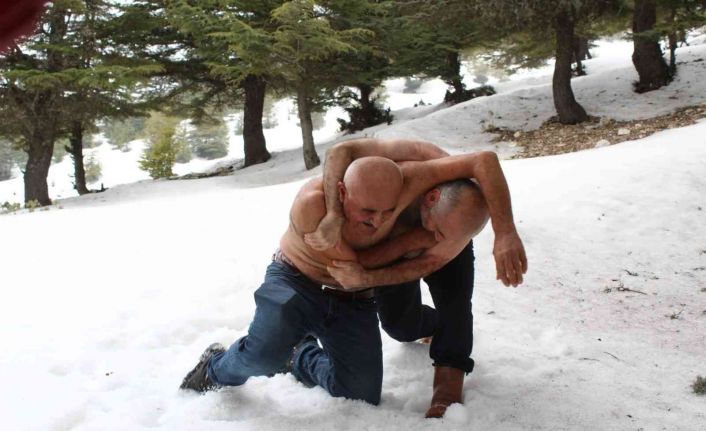 Antalya’nın Kumluca ilçesinde yürüyüş yapan doğa tutkunları her kış olduğu gibi bu kış da karın üstünde güreş tuttu.