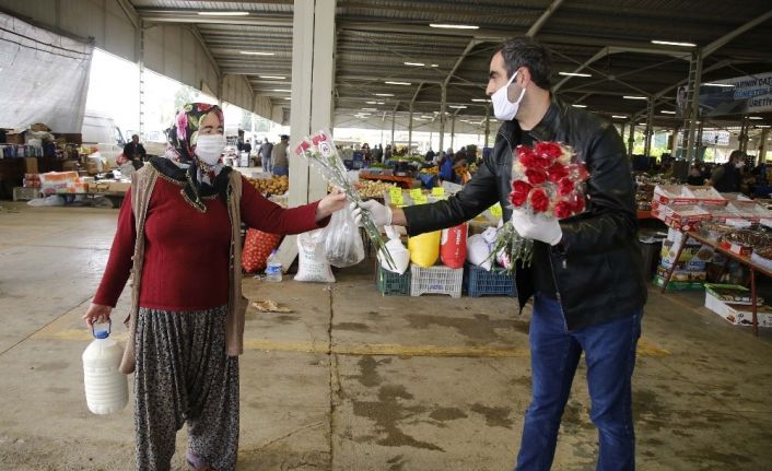 DÖŞEMEALTI BELEDİYESİ, ANNELER GÜNÜ ÖNCESİ İLÇENİN EN BÜYÜK PAZARI KONUMUNDAKİ BAHÇEYAKA KAPALI PAZARYERİ'NDE ANNE VE ANNE ADAYLARINA 2 BİN ÇİÇEK DAĞITTI.