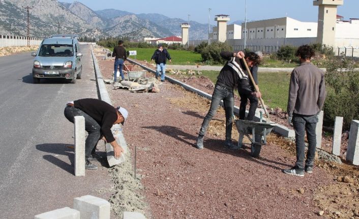Antalya Büyükşehir Belediyesi, Döşemealtı ilçesi Kırkgöz yolunda kaldırım çalışması yapıyor.