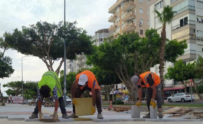 Antalya Büyükşehir Belediyesi’nin Konyaaltı ilçesi Gazi Mustafa Kemal Bulvarı’nda başlattığı kaldırım yenileme çalışması sürüyor. Kaldırım, kent estetiğine uygun mineral taşlarla yenileniyor.