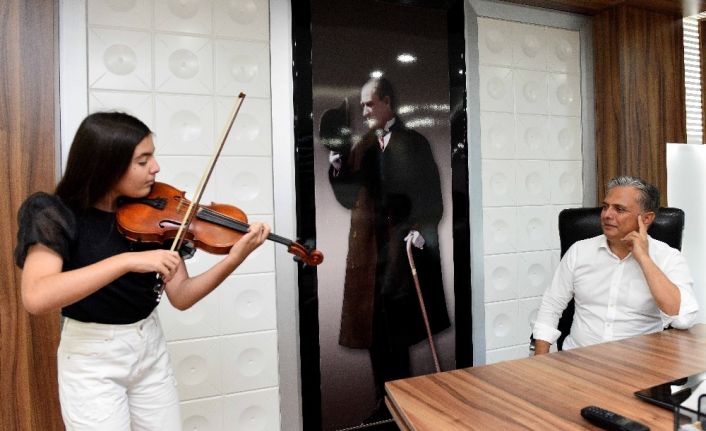 İngiltere’de 27 ülkeden 214 gencin katıldığı 3’üncü New Talent British International Youth Müzik Yarışması’nda 12-15 yaş grubunda keman performansıyla birinci olan Antalya’da yaşayan 13 yaşındaki Elif Eroğlu, Başkan Uysal’ı ziyaret etti. Ziyarette kemanı ile gelen genç müzisyen yarışmaya katıldığı beste olan Tchaikovsky’nin “melodie” adlı bestesini Başkan Ümit Uysal için çaldı. Genç müzisyeni yarışmadaki şampiyonluğundan dolayı tebrik eden Başkan Uysal, “ Bu yaşta bu kadar şampiyonluklar kazanmak kolay değil. Böyle özel bir yeteneği ağırlamaktan gurur duydum. Antalya’mızda öyle özel yetenekli gençlerimiz var. Yetenekli gençlerimiz için Türkan Şoray Kültür Merkezi’nde özel bir konser düzenleyebiliriz. Bu özel genç sanatçılarımızın içinde senide görmek isterim” diye konuştu.