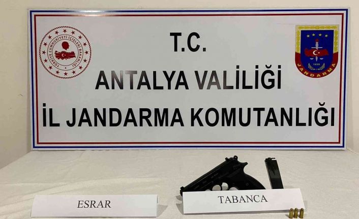 Manavgat ilçesi Ilıca Mahallesinde ikamet eden Ü.A. isimli şahsın, S.E. isimli şahıs tarafından tehdit edildiği yönündeki şikayeti jandarmayı harekete geçirdi. Manavgat Cumhuriyet Başsavcılığı koordinesinde; Manavgat İlçe Jandarma Komutanlığı ekipleri tarafından S.E. isimli şüphelinin ikametinde yapılan aramada; 4 gram esrar uyuşturucu maddesi, 1 adet tabanca, 1 adet şarjör ve 3 adet fişek ele geçirildi.