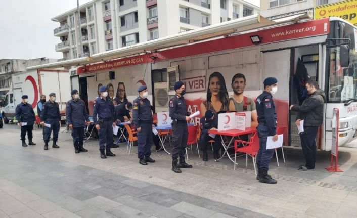 Antalya’nın Serik ilçesinde Kızılay’a destek veren jandarmalar, gönüllülük esasına dayalı olarak Kızılay’a 40 ünite kan bağışında bulundu. İlçe Jandarma komutanlığına bağlı 40 Jandarma personeli, seyyar kızılay kan merkezi önünde sıraya girdi. Dörderli gruplar halinde araca girip kan veren jandarma parsonelleri, Kızılay’a destek olmaktan mutluluk duyduklarını ifade ettiler.