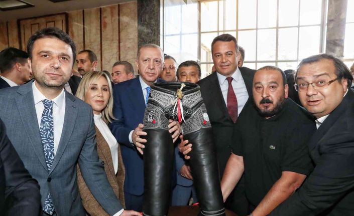Kaş Belediye Başkanı Mutlu Ulutaş, Cumhurbaşkanı Recep Tayyip Erdoğan’a "1. Kaş Belediyesi Yağlı Pehlivan Güreşleri" öncesinde kispet hediye etti.