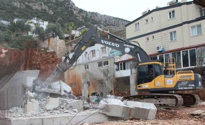 Antalya’nın Kaş ilçesinde kaçak olarak inşa edildiği tespit edilen bir yapı, belediye ekiplerince yıkıldı.