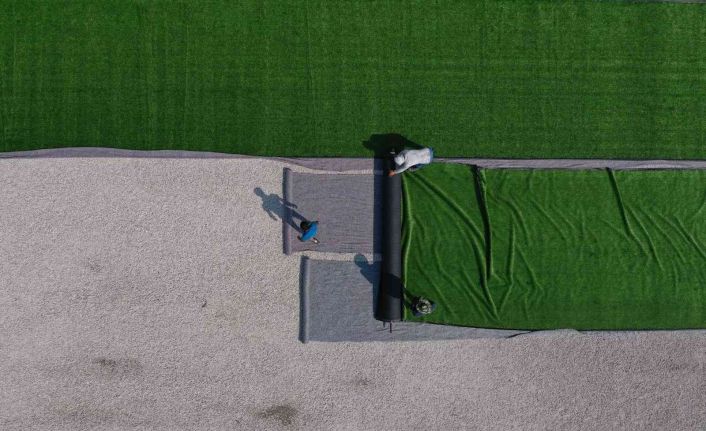 Antalya’nın Kaş ilçesinde yoğun kullanım nedeniyle zaman içerisinde deforme olan halı saha zeminleri yenileniyor.