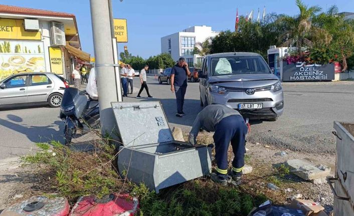 Manavgat’ta kavşak sisteminde hafif ticari araç ile otomobilin çarpışması sonucu meydana gelen kazada kontrolden çıkan araç elektrik panosuna çarparak durabildi.