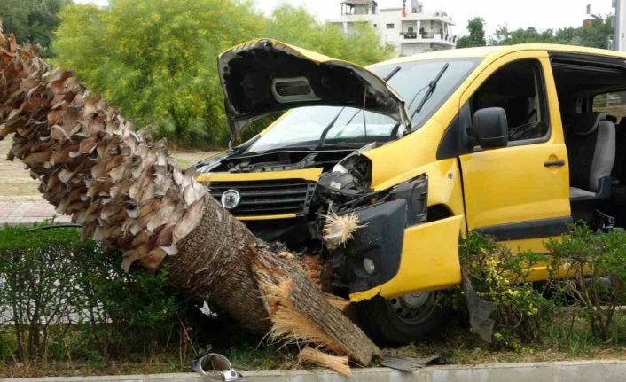 Manavgat’ta hafif ticari aracın palmiyeye çarpması sonucu meydana gelen kazada araç hurdaya dönerken, araç sürücüsü kazayı burnu bile kanamadan atlattı.