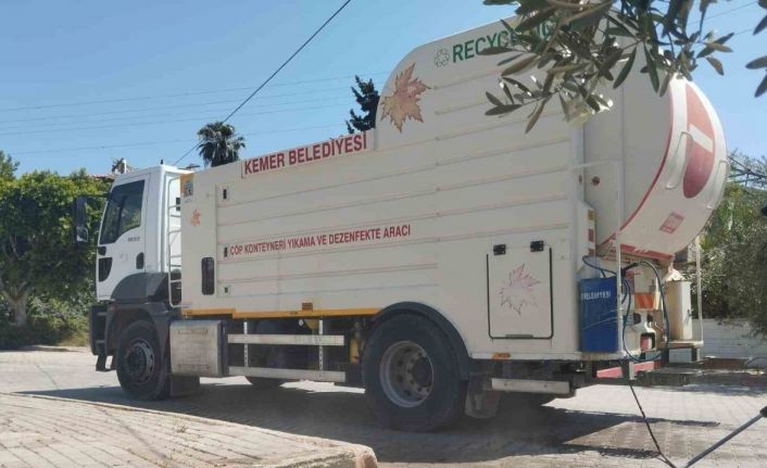 Kemer Belediyesi Temizlik İşleri Müdürlüğü ekipleri, Kemer genelinde bulunan çöp konteynerlerini sıcak ve ilaçlı suyla yıkayarak dezenfekte ediyor. Kemer Belediye Başkan Yardımcısı Semih Top, Kemer genelinde 3 bin 200 çöp konteyneri olduğuna dikkat çekerek, belediye ekiplerinin günde yaklaşık 80 konteyneri temizlediğini söyledi.