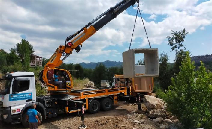 Alanya Belediyesi kış aylarında bozulan yollar iyileştirilirken, dere geçişlerine büyük çaplı menfezler yerleştiriliyor.
