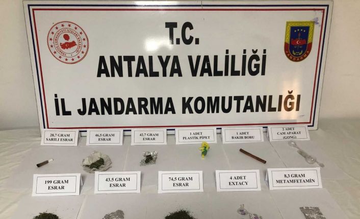 Antalya İl Jandarma Komutanlığı KOM Şube Müdürlüğü ve Aksu İlçe Jandarma Komutanlığı ekipleri tarafından Isparta - Antalya Karayolu Topallı Müşterek yol kontrol noktasında 29 Eylül Çarşamba günü icra edilen uygulamada, M.A. isimli şüphelinin kullanmakta olduğu araçta yapılan aramada, sigara paketi içinde ayrı ayrı sarılmış vaziyette 43.5 gram, 42.7 gram, 74.5 gram, esrar maddesi, 199.7 gram kubar esrar, 8.3 gram Metanfetamin, 4 adet Extacy hap ve kullanım aparatları ele geçirildi.