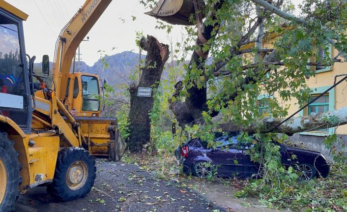 Öte yandan belediye ekipleri, Çakırlar Mahallesi’nde devrilen ağacın altında kalan bir otomobil ve traktöründe kurtarılması için çaba harcadı.