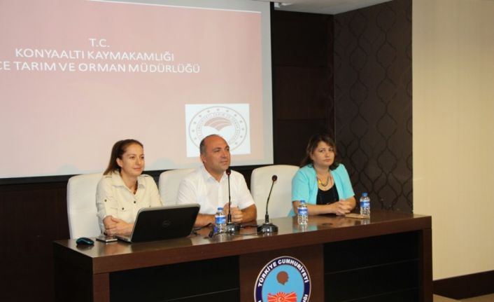 Antalya İl Tarım ve Orman Müdürlüğü, Konyaaltı İlçe Tarım ve Orman Müdürlüğü, Ticaret İl Müdürlüğü, Aile ve Sosyal Politikalar İl Müdürlüğü, Kadın Girişimciliği Kooperatifleri temsilcileri, muhtarlar ve üreticiler ile birlikte Kadın Kooperatifleri konulu geniş katılımlı toplantı düzenlendi. Konyaaltı Kaymakamlığı konferans salonunda düzenlenen toplantı programına, Antalya İl Tarım ve Orman Müdürlüğü Koordinasyon ve Tarımsal Veriler Şube Müdürü İbrahim Irmak, Konyaaltı İlçe Tarım ve Orman Müdürü Canan Otruş, İl Ticaret Müdürlüğü yetkilisi Sibel Ersöz, Aile ve Sosyal Politikalar İl Müdürlüğü yetkilisi, TOBB Kadın Girişimciler Kurulu İcra Kurulu Üyesi Münevver Gençtürk, S.S. Çevre Gıda Kadın Girişimi Üretme ve İşletme Kooperatifi Başkanı Kezban Kaya, S.S. Engelliler ile Engelli Çocuk Ailelerine Destek Kadın Girişimi Üretme ve İşletme Kooperatif Başkanı Gülsüm Soyak ile Konyaaltı muhtarları, üreticiler ve teknik personellerden oluşan 78 kişi katılım sağladı.