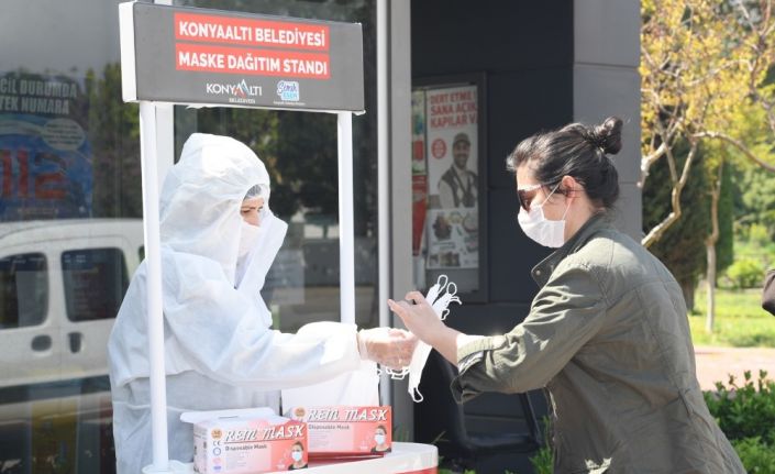 Konyaaltı Belediyesi korona virüsü ile mücadele kapsamında bankamatik, market ve mahalle muhtarlıkların önlerinde kurulan stantlarda vatandaşlara ücretsiz maske dağıtıyor. Mobil maske dağıtım araçları ile de sokaklarda devriye yapan ekipler, aynı şekilde maske dağıtmaya devam ediyor.