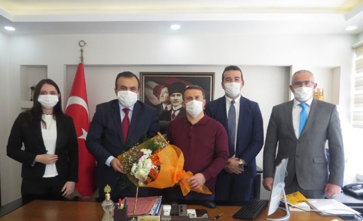 Vergi Dairesi Müdür Yılmaz Külen, Kaymakam Ömer Çimşit’e çiçek takdim etti.