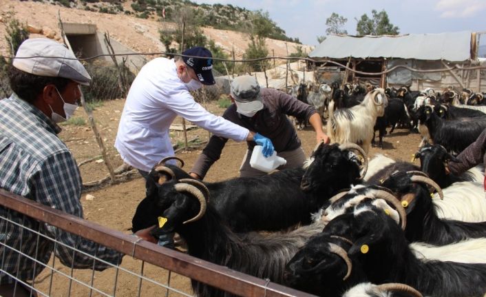 Korkuteli’de küçükbaş hayvan yetiştiricilerine pandemi kapsamında bilinçlendirici eğitimler veren Antalya Büyükşehir Belediyesi veteriner hekimleri, 800 küçükbaş hayvana iç-dış parazit ilacı uygulaması yaptı.