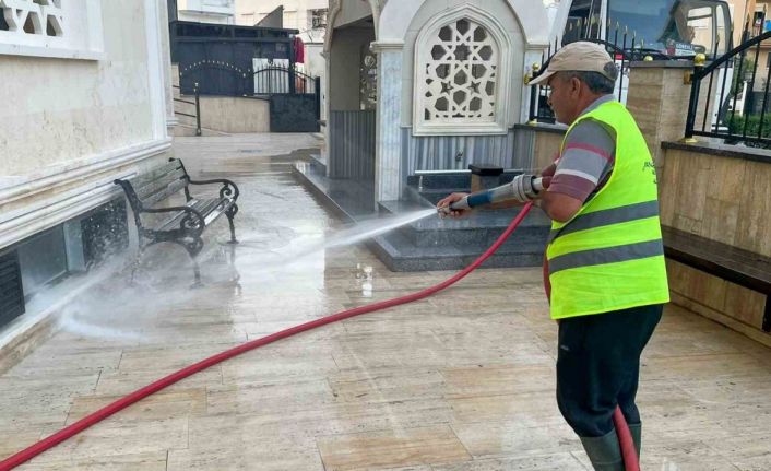 Caminin iç ve dış mekanlarında gerçekleştirilen temizlik çalışmaları kapsamında cami avluları ve abdesthaneler temizleniyor; mihrap, minber ve kürsü gibi alanlar dezenfekte ediliyor.