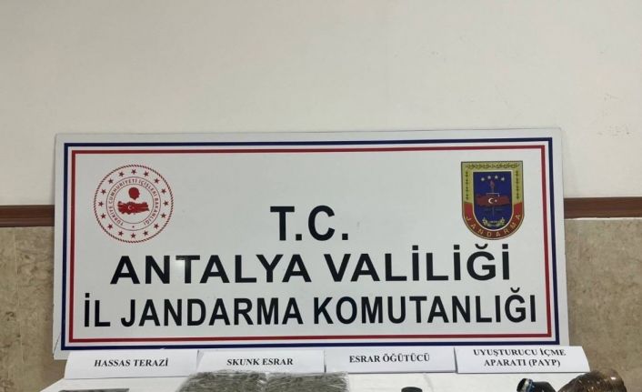 Manavgat Cumhuriyet Başsavcılığının talimatıyla Antalya İl Jandarma Komutanlığınca, uyuşturucuyla mücadele kapsamında çalışma yürütüldü. Bu kapsamda M.Z. isimli şüpheliye ait araçta ve ikamette yapılan aramalarda, 250 gram skunk, 1 adet hassas terazi, 1 adet uyuşturucu öğütme aparatı ve 1 adet uyuşturucu içme aparatı ele geçirildi.