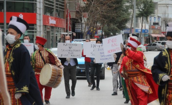 Antalya’nın Korkuteli ilçe Belediyesi Mehter Takımı yeni tip Korona virüsten (Kovid-19) korunmak için evlerinden çıkmayanlara sokak sokak gezerek konser verdi.