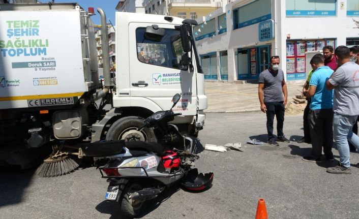 Antalya’nın Manavgat ilçesinde motosikletin belediyeye ait yol süpürme aracına çarpması sonucu meydana gelen kazada sürücü yaralandı. Kaza anı anbean güvenlik kameralarına yansıdı.